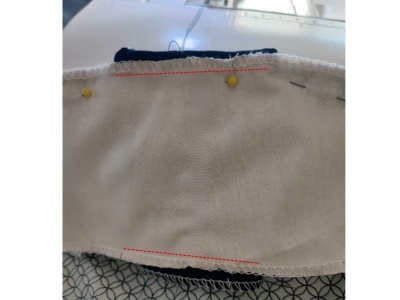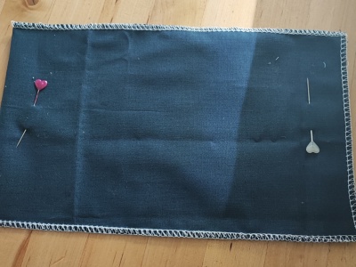 Prends un des grands morceaux de tissu envers face à toi, et marque le milieu du grand arrondi à l’aide d’une épingle. Marque également le milieu du soufflet.