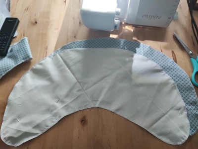 Place maintenant le soufflet au centre de l’arrondi marqué sur le grand morceau de tissu (endroit contre endroit) et épingle-le soigneusement. Couds le soufflet à une largeur de pied-de-biche avec un point droit sur toute la longueur.