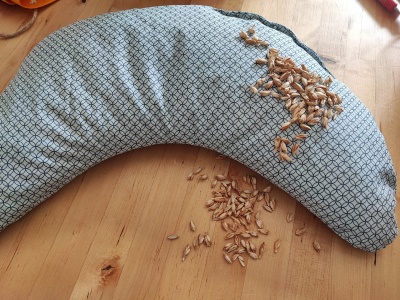 À l’aide d’un entonnoir, remplis le coussin de balle d’épeautre jusqu’à obtenir la fermeté souhaitée.