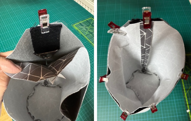 Passer la sangle dans l’anneau etla plier en deux. Fixer la sangle entre les deux pièces de tissu (au milieu de la couture). Epingler maintenant les deux sacs ensemble et coudre tout autour avec une marge de couture de 1 cm.