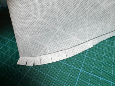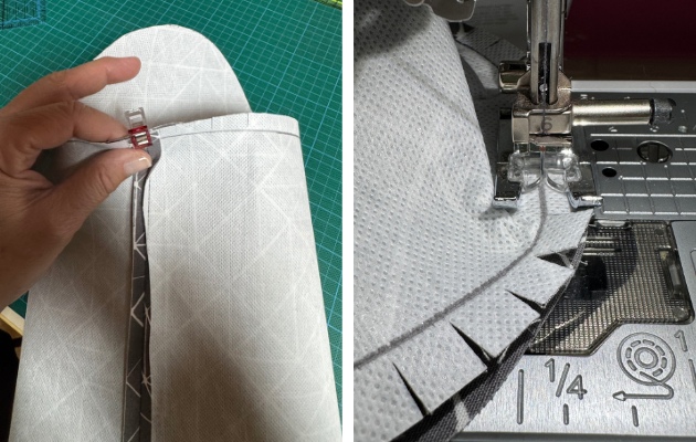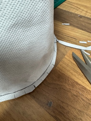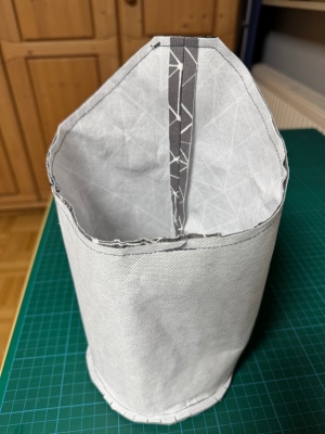 Le tissu extérieur et le tissu intérieur sont pliés et cousus ensemble sur le bord long avec un recouvrement de 1 cm. Pour le tissu intérieur, laisser l’ouverture de retournement ouverte ! Repasser les deux coutures (également l’ouverture de retournement). Pour les deux tissus, il faut maintenant couper avec des ciseaux le bord inférieur, là où le fond sera cousu plus tard, à une distance d’environ 1 cm jusqu’à ce qu’il se trouve juste devant la marque de la marge de couture. Veiller absolument à ne pas couper jusqu’à la ligne et à laisser un espace de quelques millimètres par rapport à la ligne ! Les incisions permettront de mieux poser le fond plus tard lors de la couture.
