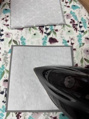 Comme notre sac est entièrement fabriqué en coton, nous avons renforcé toutes les pièces de tissu avec de la Vlieseline pour lui donner plus de stabilité. La Vlieseline a été découpée un peu plus petite que les pièces de tissu. Ainsi, la planche à repasser reste protégée des résidus de colle lors du repassage.