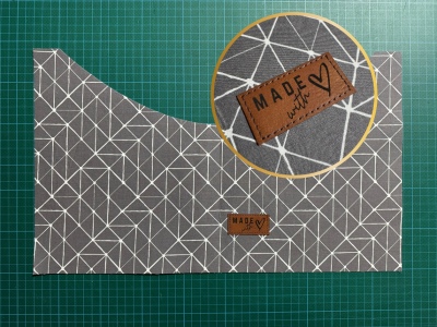 Avant de passer à la couture, tu peux coudre une belle étiquette sur la partie extérieure du sac. Notre étiquette en similicuir « MADE with Love» mesure 2,5 cm x 5 cm. Nous l’avons placée comme suit : Lorsque la pièce de tissu est étalée, mesure environ 16 cm du coin inférieur droit vers le milieu et 4,5 cm du bord inférieur vers le haut. À ce point, tu places le coin inférieur droit de l’étiquette et tu la couds ensuite (pour que l’étiquette ne glisse pas lors de la couture, tu peux coller une bande de ruban adhésif Wonder-Tape sur l’envers).