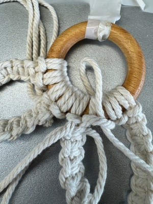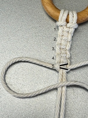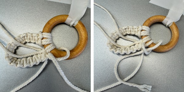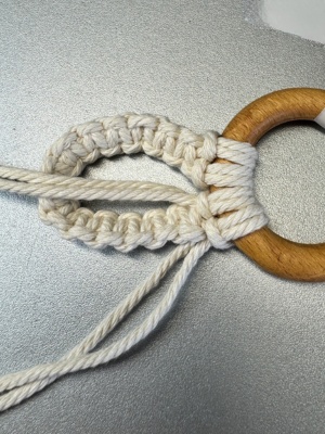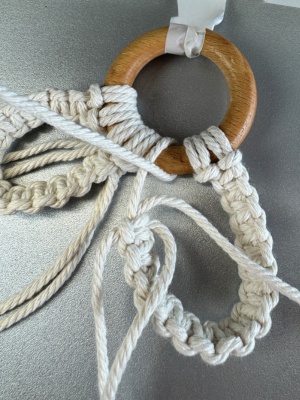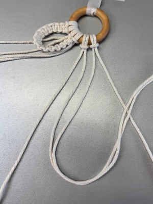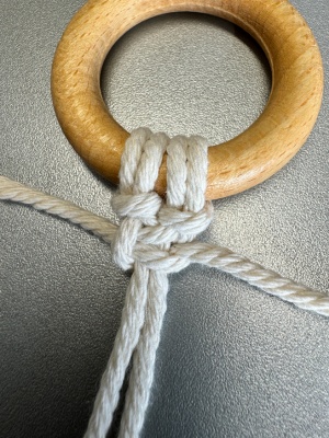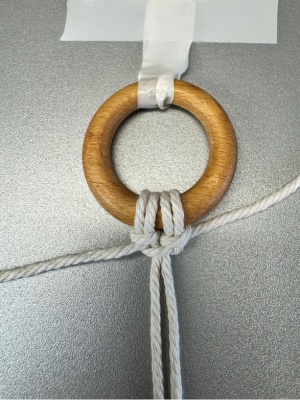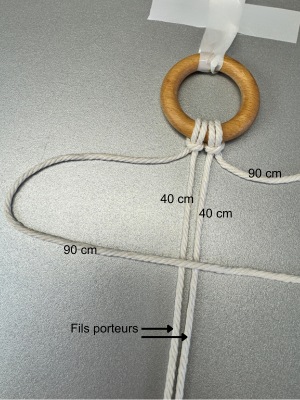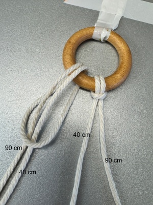 Nous commençons par le premier fil, qui est doublé, mais de manière à ce qu’une partie du fil mesure 40 cm et le reste 90 cm. Fixe-le à l’anneau en bois à l’aide d’un nœud à tête d‘alouette. Répète l’opération avec un second brin. Les deux parties courtes se trouvent au milieu.