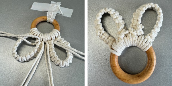 Répéte maintenant toutes les étapes pour la deuxième oreille. Pousse l’oreille terminée vers la gauche et prends les deux fils restant, et fixe-les avec un nœud à tête d‘alouette. Faiss ensuite à nouveau 14 nœuds plats.