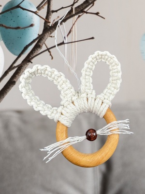 Tu peux également réaliser des suspensions en forme de lapin de Pâques à partir de ces instructions. Pour cela, tu dois prendre une petite boule en bois (1 cm de diamètre) pour le nez et passer quelques fils de macramé à travers le trous. Colle-les à droite et à gauche de la boule pour qu’ils ne glissent plus.