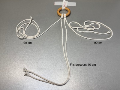 Maintenant, nous allons attacher les fils à l’anneau. Mets les deux fils extérieurs de côté, on n’a besoin que des deux fils du milieu (fils porteurs) pour l’instant.