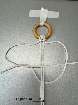 Place l’anneau avec les quatre fils devant toi comme sur l’image. Les deux fils du milieu sont les fils porteurs.