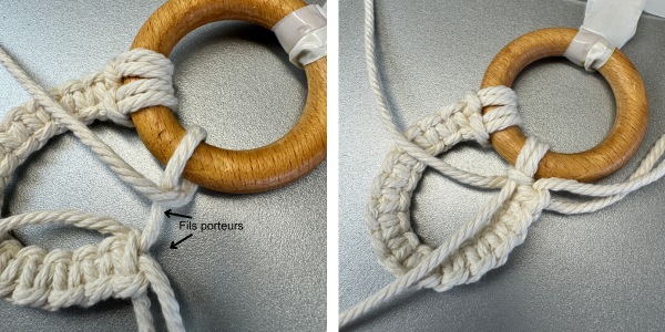 Prends maintenant le fil de droite, passe-le par-dessus le fil que tu viens de poser. Soulève légèrement les deux fils porteurs et passe-le sous les deux fils porteurs à travers la boucle de gauche, de l’arrière vers l‘avant.