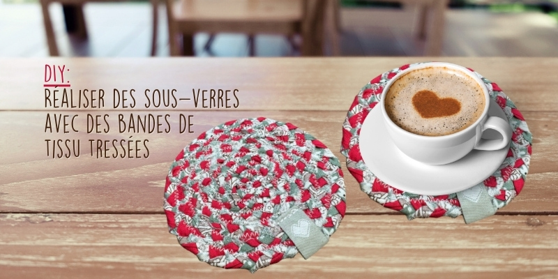 Voici un projet de mise en valeur de dechêts (Upcycling) qui peut être réalisé à peu de frais avec des restes de tissu colorés: des sous-verres fabriqués avec des bandes de tissu tressées.